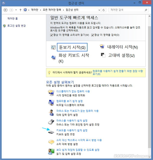 제어판의 접근성 센터에 가면 ‘키보드를 사용하기 쉽게 설정’하는 메뉴가 보이는데요 여기서 설정합니다