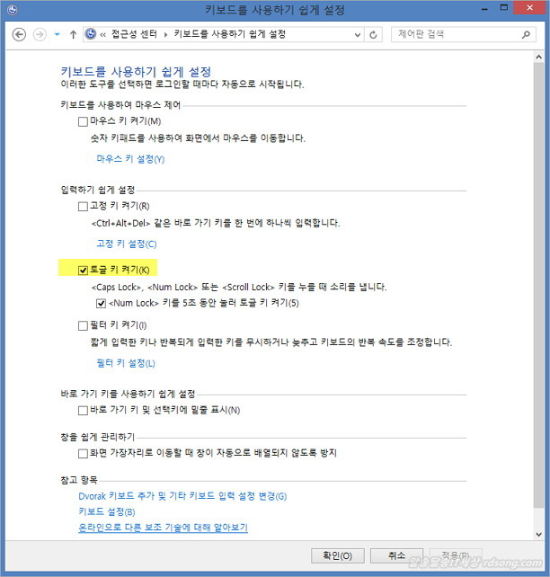 이곳에는 토글키 켜기라는 부분이 존재하는데 <caps lock> <num locks> <scroll lock> 키가 눌려지자 마자 비프음을 발생하여 방금 눌려졌는지 바로 소리로 확인이 되므로 바로 한번더 caps lock 키를 눌러 해제 시킬수 있습니다