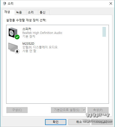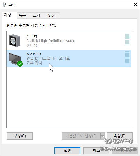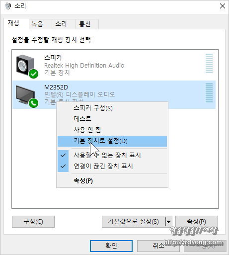그러면 아래처럼 기본장치로 바뀌고 녹색으로 체크가 되어 있어야 합니다 그럼 이제부터 소리는 모니터스피커로 소리 출력이 됩니다