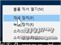 바탕화면의 우측 하단의 사운드 스피커 아이콘 위에서 마우스 우측을 눌러 설정 합니다 재생장치 입니다
