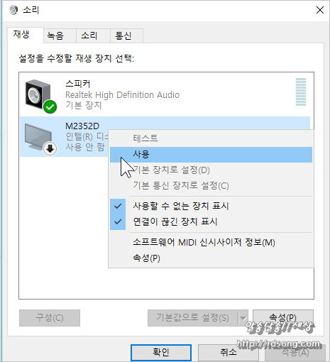 모니터를 기본 장치로 설정 하려고 했더니만 비활성 되어 있습니다 먼저 사용을 눌러 줘야 합니다