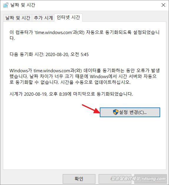 인터넷 시간 에서 설정 변경을 클릭하고 들어가서 동기화 한번 진행 하면 시간 날짜가 한국시간으로 정확히 세팅이 됩니다.