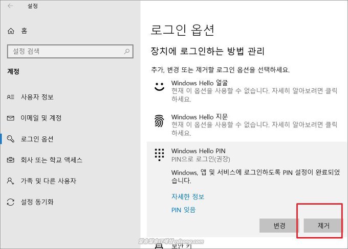 윈도우10 설정을 하면 기본적으로 (최신 윈도우10) pin 번호를 설정하여 윈도우 10 로그인 하도록 되어 있는데 이게 때론 불편 할 때가 있는데 핀 제거