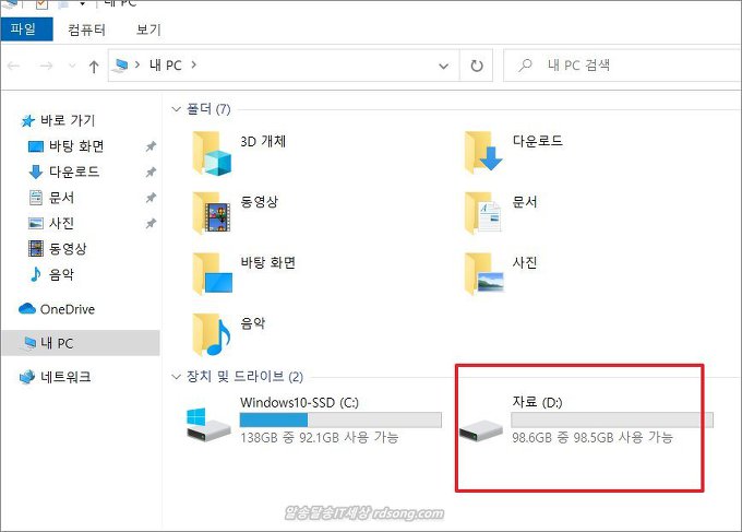 SSD 또는 저장공간 파티션 분할, 볼륨축소 하여 D 파티션 (드라이브) 생성 할수 있습니다.