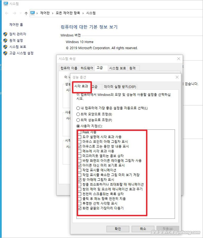 윈도우10 최적화 중에 가장 중요한 포인트: 성능옵션 > 시각효과