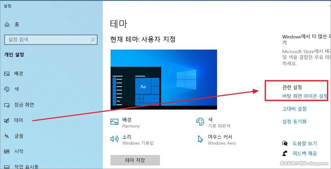 바탕화면에 마우스 우측 눌러 보면, 개인설정 > 테마 들어 갑니다. 어디?에 쳐박혀 있습니다. 꺼낼수 있게.