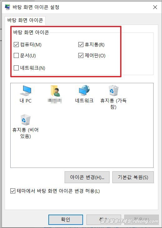 바탕화면에 컴퓨터 아이콘, 휴지통 아이콘, 제어판 문서 네트워크 바로가기 꺼내 놓을 수 있습니다