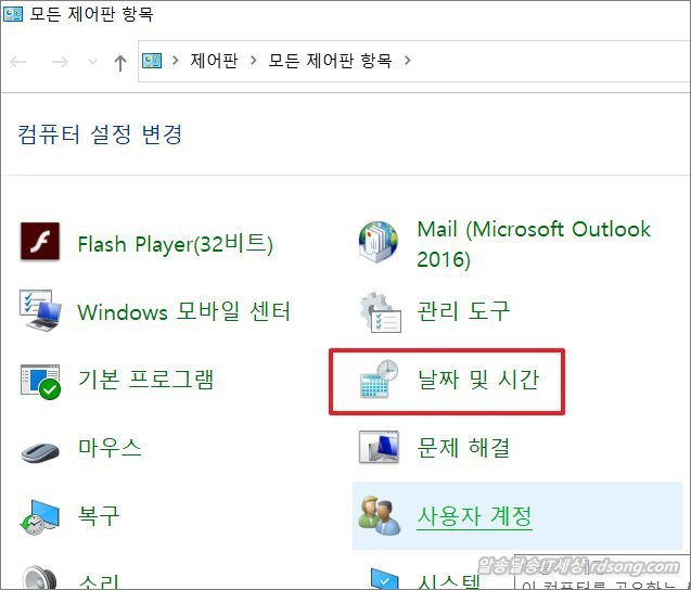 컴퓨터 윈도우10 설치 하고 나면 날짜와 시간이 맞지 않는 경우가 있습니다. 그럴때는 제어판에 가서 날짜 및 시간에서 동기화를 한번 해 주면 됩니다.
