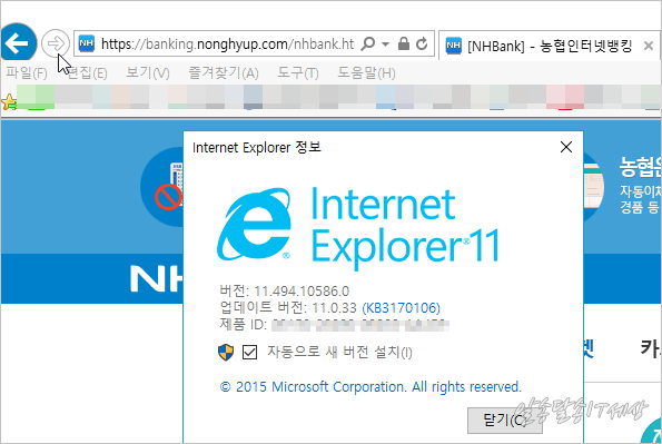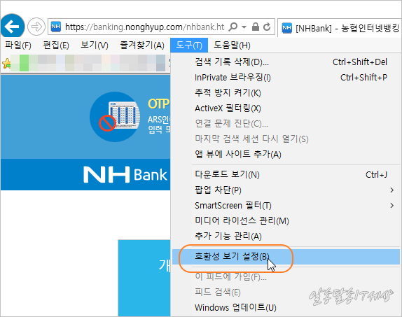 농협인터넷 뱅킹을 윈도우10 익스플로러 11 사용시 호환성보기에 뱅킹사이트 추가해 주자 ( 익스 쓰지 말고 크롬 쓰자)
