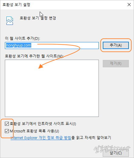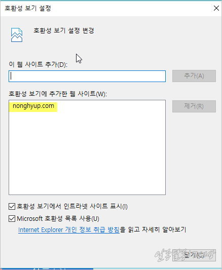 호환성 보기 설정에 가면 nonghyup.com 이 자동으로 뜨면서 ‘ 추가 ‘ 를 해주고