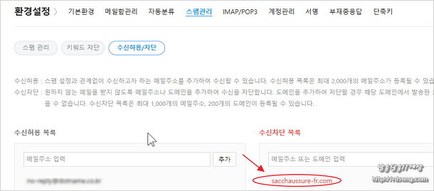 그런데 이 기능이 잘 작동하지 않는다 차단 해야 될 스팸도메인을 입력했는데 전혀 차단이 되질 않고 있다