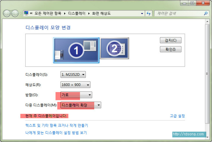 윈도우 xp에서도 아래 화면과 비슷한데요 컴퓨터 모니터에 맞게 디스플레이 확장해 주는 옵션을 잘 이용하여 체크해주어야 할겁니다 너무오래 되어서 생각이 잘 …ㅠㅠ