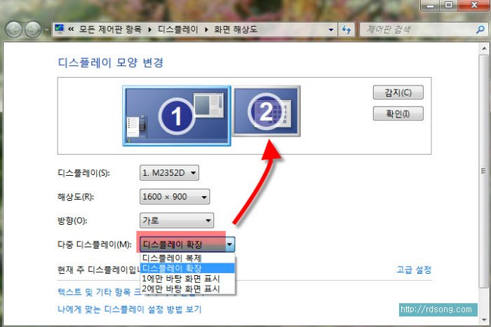 디스플레이 확장 : 1번화면을 확장하여 2번화면 까지 쓰게 된다고 보면 됩니다
