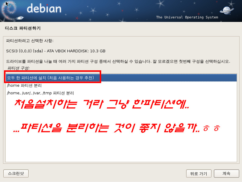 파티션을 원래 제대로 나눠서 써줘야 하겠지만, 어차피 처음 설치하는거라 뭐가 뭔지 잘 모르므로