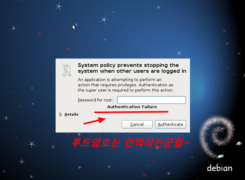 라이브 버젼에서 설치후 다시 사용자를 root 로 전환하여 설정을 좀 하려 했드만 …