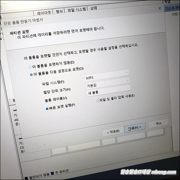 NTFS 파일시스템 으로 두고 할당크기 기본값 두고 볼륨레이블 적당한 이름으로 바꿔도 되고 그대로 진행 했습니다.
