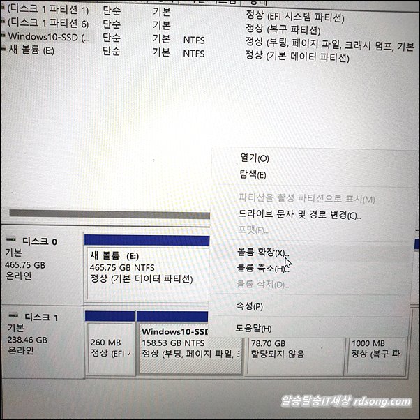 c 드라이브 볼륨확장 할 것이므로, c 볼륨 위에 마우스 우측 버튼 눌러 [ 볼륨 확장 ] 선택 합니다.