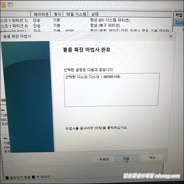 볼륨 확장 마법사 완료 및 파티션 C 합치기 완료 , 마침 눌러 줍니다.