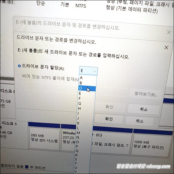드라이브 문자 할당 D 선택 해 줍니다.