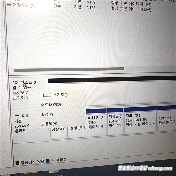 그런데 디스크 관리 에서 동일하게 초기화 없음 뜨므로 마우스 우측 눌러 , 디스크 초기화 합니다.