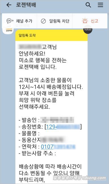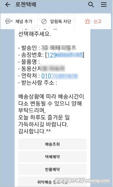 로젠택배 카톡 알림톡 스미싱 ? 명절 때만 되면 택배스미싱 아닐까 싶습니다. 물론 잘못 전달되어 알림톡 올수도 있겠지만, 참고로 스미싱 주의 해야 합니다.
