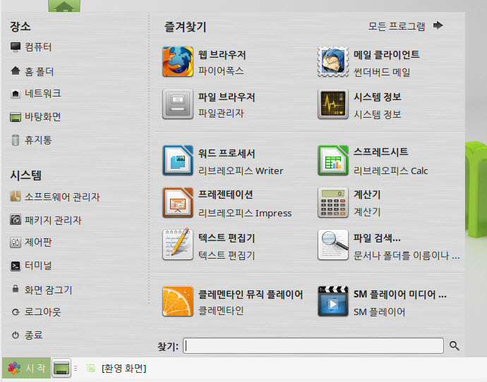 민트 하모니카를 설치하고 나면 윈도우처럼 시작화면이 나오고 제어판도 보이고, 모든 프로그램도 보인다 윈도우와 가깝게 친근한 인터페이스 구조이다 특히 한글이 적용된 상태라 한글을 따로 적용할 필요가 없다