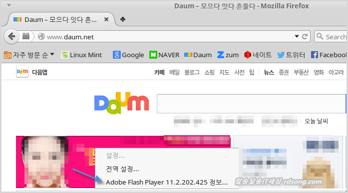 아래 파이어폭스에서 플래쉬에 마우스 우측을 눌러 확인하면 최신플래쉬가 적용된 것을 확인 해 볼수 있다 그러나 패키지 자동업데이트 숙제는 남아 있다