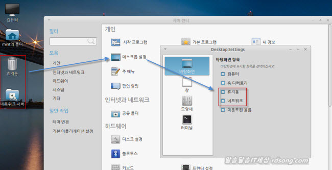 제어센터에서 데스크탑 설정에서 ‘바탕화면’에서 체크를 해주면 바탕화면에 휴지통이 나타난다