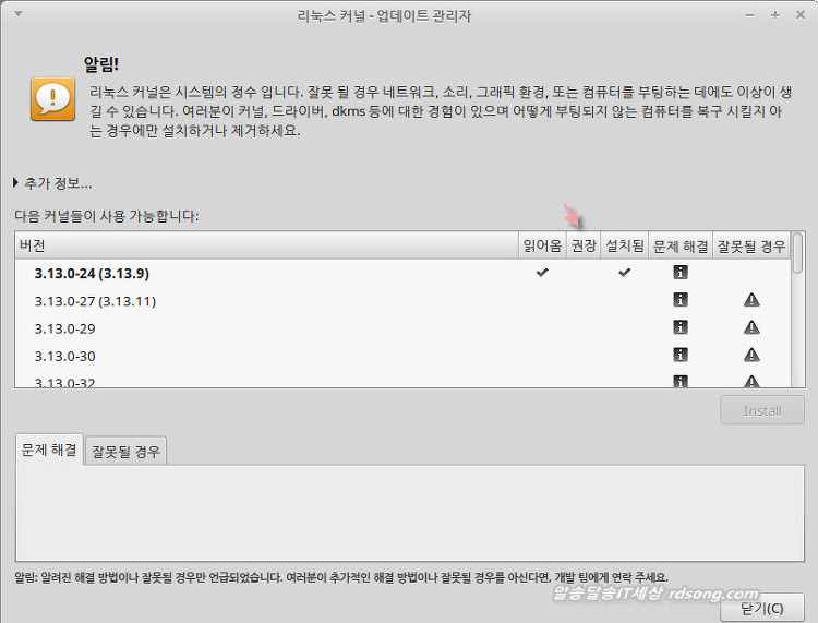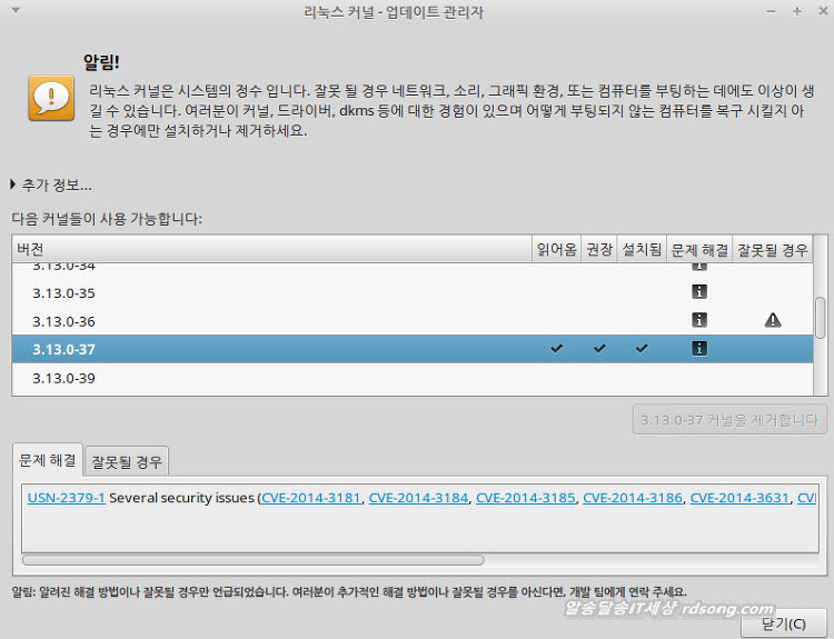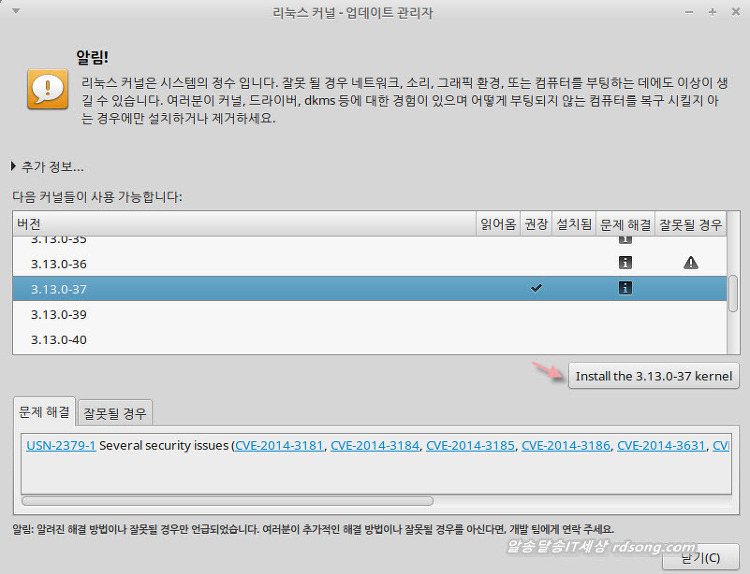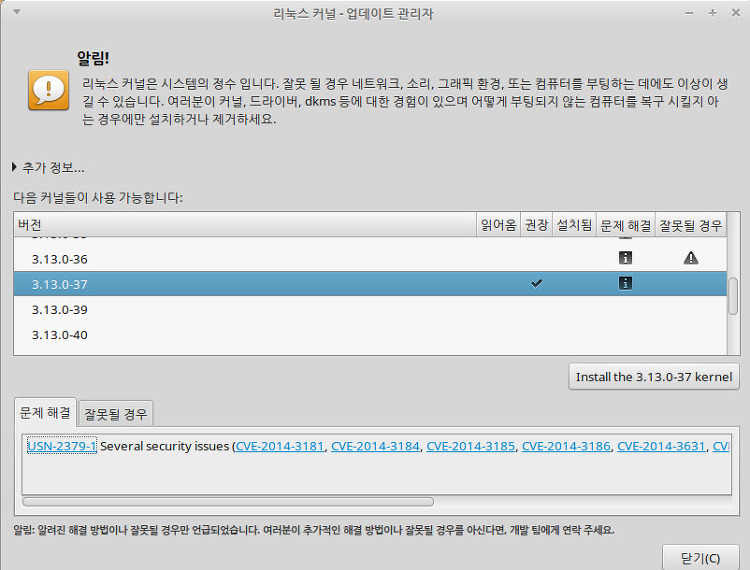 민트커널 3.13.0-37 버젼이 권장이라고 체크가 되어 있으며 문제해결등은 읽어 보는 것이 좋습니다 여기 읽어 보면 여러가지 보안적인 이슈사항이 영어로 나열되어 있는데 영어라 읽기가 불편하죠 거부감도 들고…
