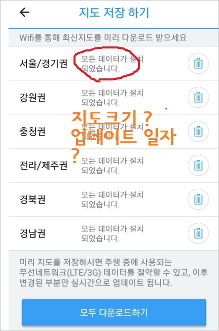 그런데…지도 업데이트를 하긴 하는데 언제 업데이트가 되었는지 날짜가 없어서 불편 했고 , 스마트폰으로 내려받은 지도의 용량표시도 있으면 얼마나 좋을까?