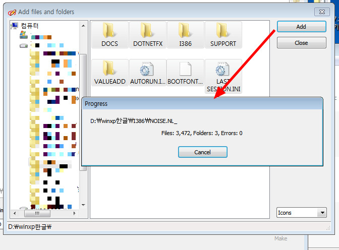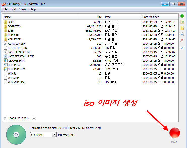 갠적으로 가지고 있는 윈도우 xp 한글 버젼을 ISO이미지 파일로 만들어 보는 과정입니다 이미지를 생성하고 싶은 파일을 추가해 주면 되고 ,적절한 이미지 포멧인 CD 이미지 iso9660을 선택,