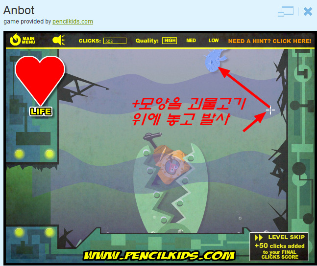 아래단계는 한참 헤멨는데 ..+자 모양을 퍼런 물고기 위에 놓고 슈팅을 해야 합니다 타켓이 맞지 않으면 괴물 물고기 잡기 어렵습니다