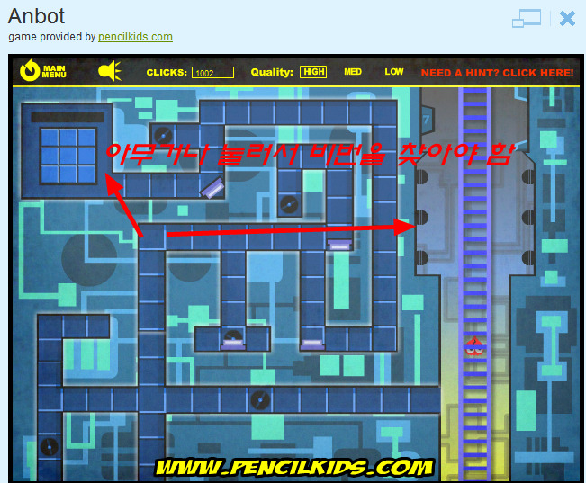 패스워드를 풀어야 되는데 맨땅에 해딩하는 듯한 것인데 좌측상단에 암호를 잘 찾아서 클릭하여 입력을 해야만 사다리에 레이져가 사라져 anbot이 사다리를 타고 이동을 하게 됩니다