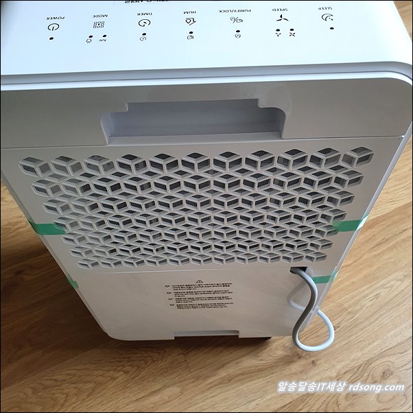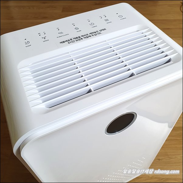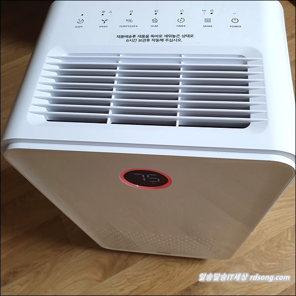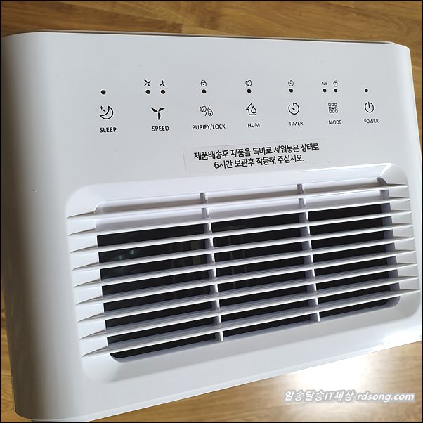 송풍구 상단에 보면 터치 버튼식으로 되어 있습니다, 제품 도착 개봉 후 사용은 6시간 후에 제습기 쓰라고 되어 있습니다.