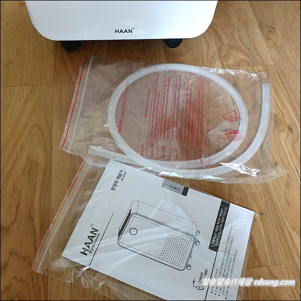 호스 1개 , 설명서 들어 있습니다. 후면에 제습 물탱크 용량 2L 붙어 있습니다 제습 된 물을 물통으로 저장 하지 않고 바로 연속 배수호스 연결 하여 사용 할수 있도록 구성 되어 있습니다.