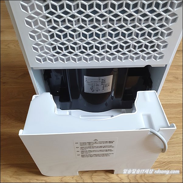 제습기 후면 하단에 물통 2리터 오픈 , 위에 물통 커버 있습니다. 물이 만수 , 즉 물이 꽉 차게 되면 자동으로 제습기 가동 중지 되도록 설계 되어 있다고 합니다.