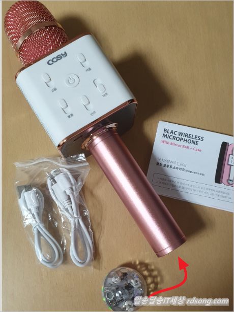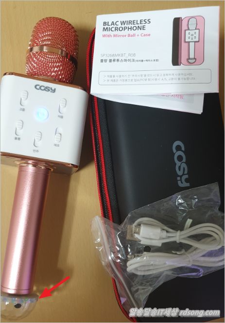 cosy 블랑 블루투스 마이크 SP3268MKBT 설명서 외에 마이크 , 미러볼( 블루투스 마이크 하단에 장착) 케이스 제공,마이크로 5핀 유선 AUX 케이블, 마이크로 5핀 충전케이블 포함 되어 있습니다.
