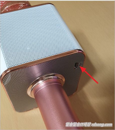 아래 사진에서 마이크 손잡이 스피커 부분 아래에 마이크로5핀 케이블 이용하여 충전 하면 됩니다. 또는 마이크로 5핀 어댑터 있다면 직접 충전하면 됩니다.