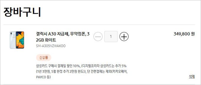 무약정폰으로 삼성 홈피에서 직접 구입해서 쓸수 있는데 갤럭시 A30 가격 349,800 원이다