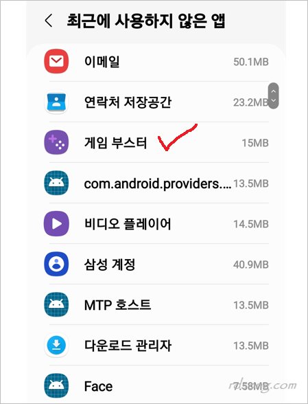 디바이스케어 열어 보면, 램 터치 하고 최근에 사용하지 않은 앱 터치해 보면 게임부스터 앱 나올 수도 있습니다.