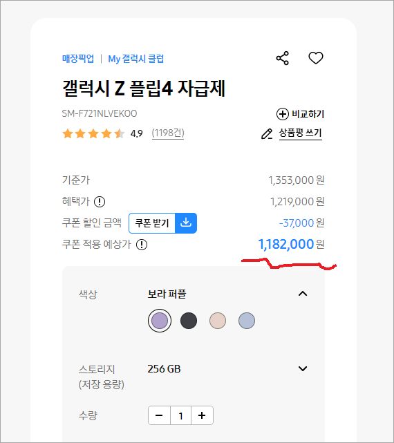 할인 적용하여 저장공간 256G 선택 하면 z플립 가격 1,182,000원 입니다.