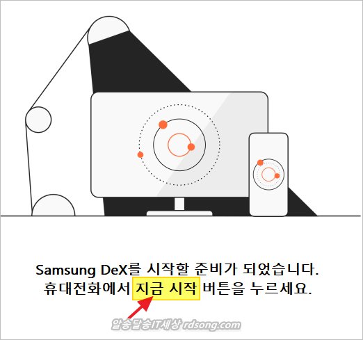 스마트폰 하단 팝업창에 [ 지금시작] 터치 하면 삼성 덱스 dex 연결 될 것입니다.