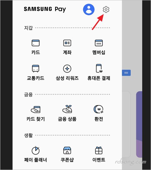 삼성 페이 , 좌측 메뉴 터치 > 우측 상단의 톱니모양 아이콘 터치 해 볼까요?