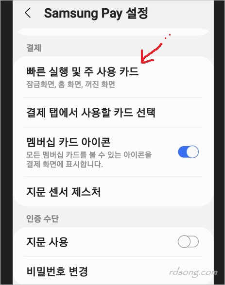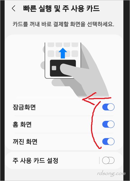 잠금화면, 홈 화면 ,꺼진 화면에서 카드 결제 빨리 뜨게 설정 하는 부분 입니다.