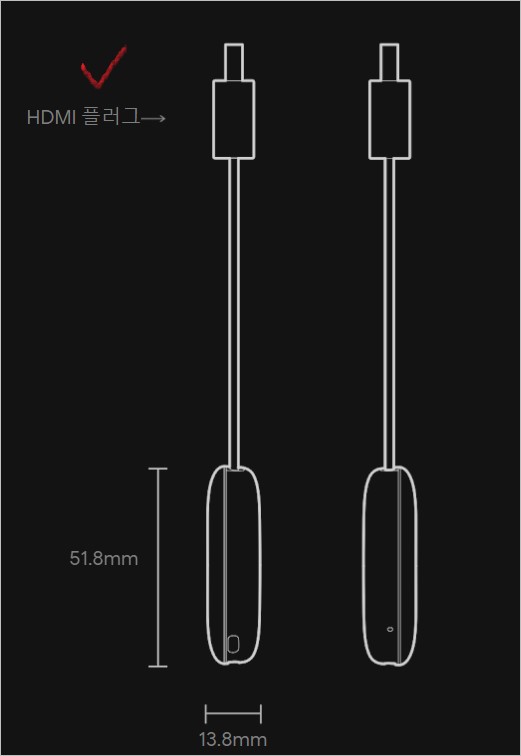 길이는 51.8mm 이며 크롬캐스트 해상도는 60fps 에서 1080p지원, 무선 와이파이(wi-fi) 802.11ac (2.4Ghz/5Ghz) 지원 , 전원은 5V 마이크로 usb 전원 공급하며 hdmi 연결포트를 가지고 있다