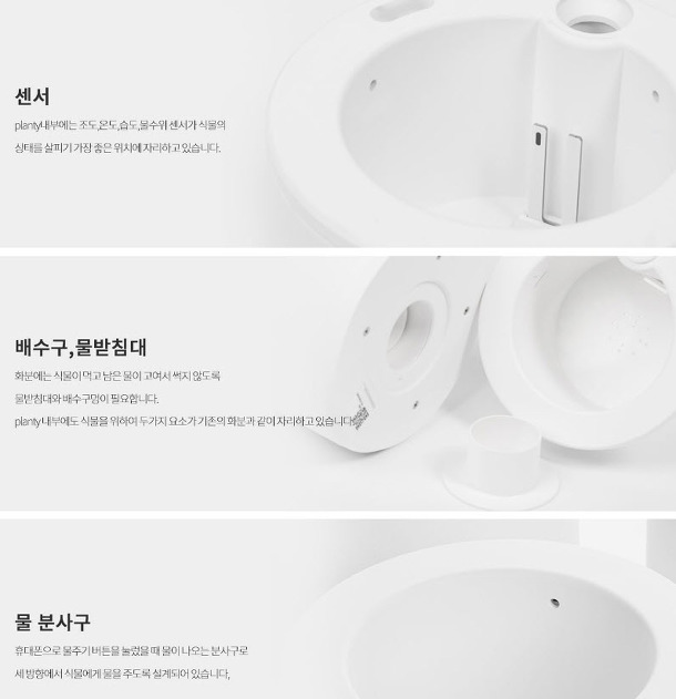 센서가 물이 부족하면 알람으로 알려주고 분사구를 통해 물을 주기도 합니다