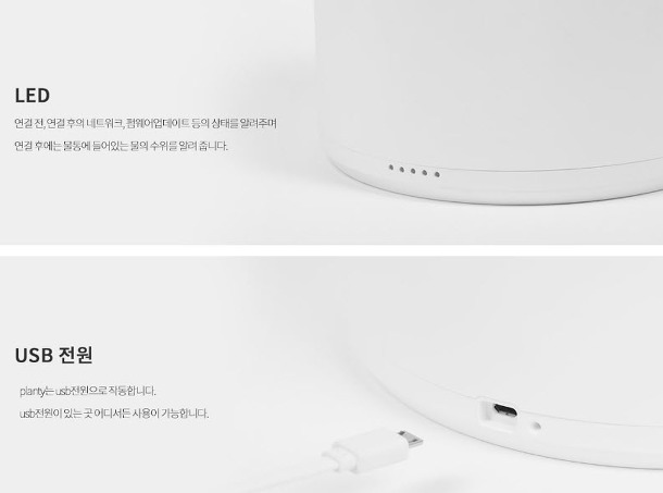 플랜티 스마트화분은 USB 전원을 연결하여 사용해야 하며 물의 수위도 LED센서로 알려줍니다