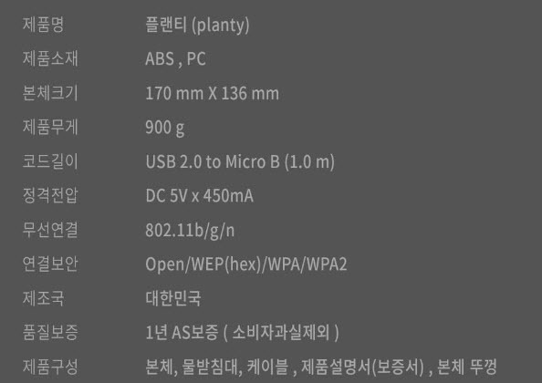 플랜티 화분 무게는 약 900g 이며 usb 전원이 연결이 되어 있어야 하고 무선연결이 되어