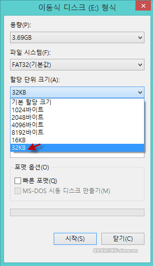 마이크로SD PC포멧을 형태는 ntfs로 할것인가 ? FAT, FAT32로 할것인가?  필자는 파일시스템은 FAT32로, 할당단위크기는 최대 32KB로 했습니다