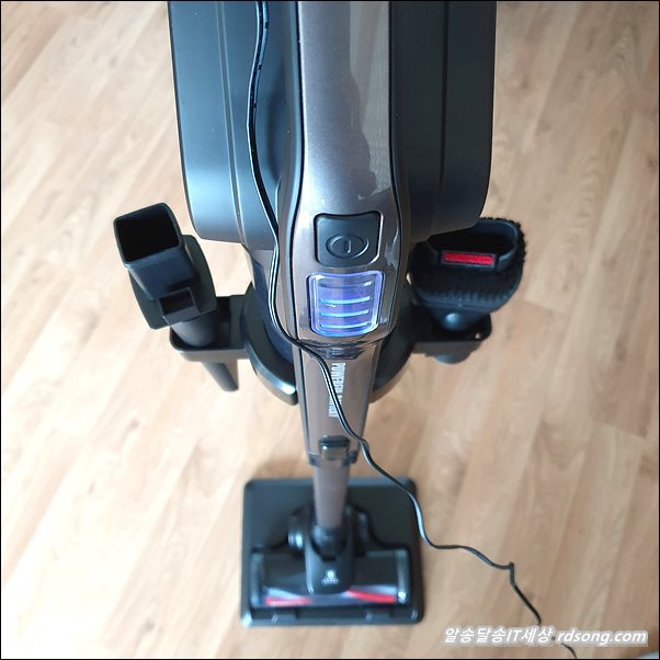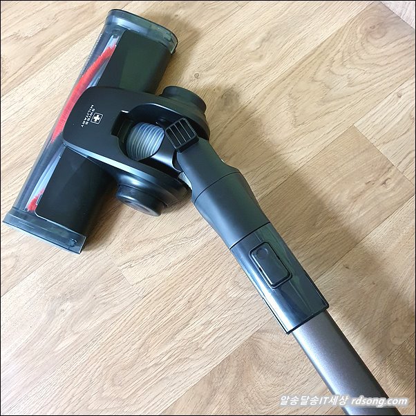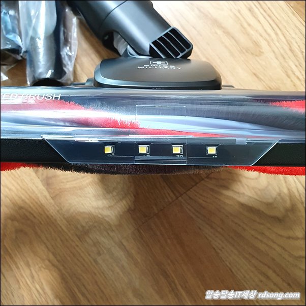 브러쉬 헤드 앞쪽에 LED 라이트가 탑재되어 있어서 청소 할때 바닥면 먼지가 디테일 하게 보입니다. 근데 브러쉬 삘릴리 합니다.